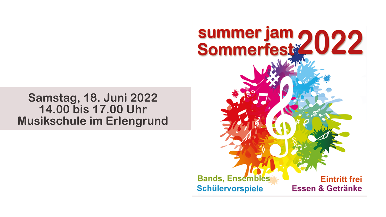 Das Sommerfest/SummerJam 2022 wirft seine Schatten voraus. Am Samstag, 18. Juni 2022 steht die Musikschule im Erlengrund, Gabelhorst 38 von 14 bis 17 Uhr allen Besuchern offen. Der Erlengrund soll eine Art klingendes Gebäude oder ein kleines Festival werden – überall aus dem Erlengrund und um die Musikschule herum soll Musik erklingen.